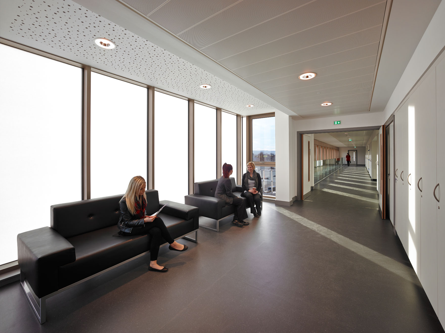 OKALUX light-diffusing insulating glass elements illuminate rooms evenly to a depth of 50 feet with minimum shadowing. The light-diffusing properties of OKALUX are due to a capillary inlay in the interpane cavity, enabling a truly natural expression of the entire light spectrum. The Color Rendering Index of standard OKALUX glass is 96% – 97%, very close to natural daylight. Okalux, Okalux+, Okalux K, and Okalux EVO